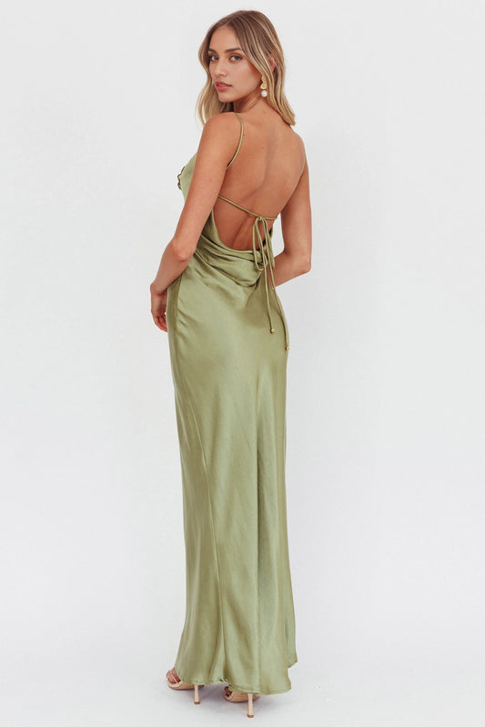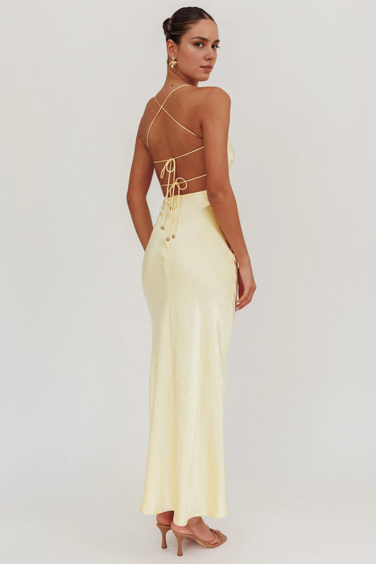 Charming satin super long high slit backless lace up adjustable shoulder strap invisible zipper bridesmaid dress
