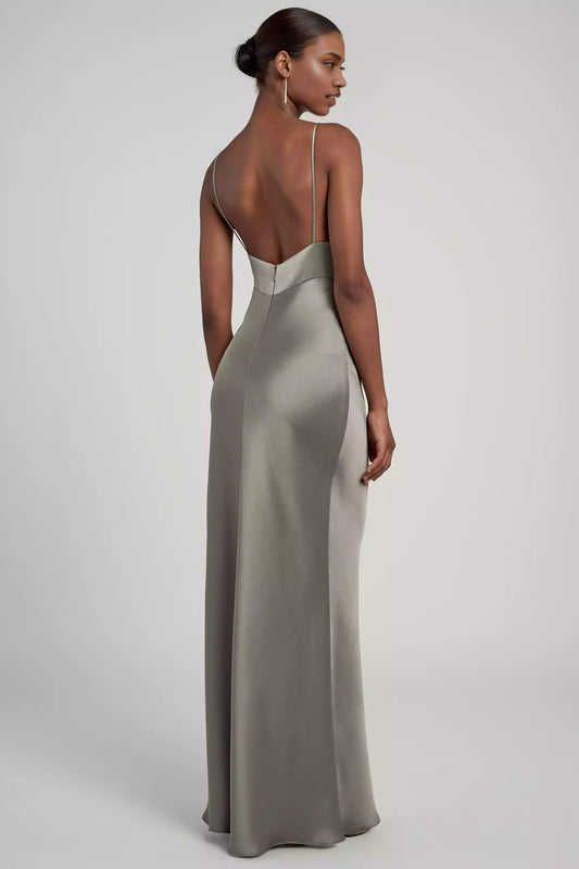 Classic suspender satin V-neck slim shoulder strap, low round neck, diagonal cut skirt, back middle zipper Bridesmaid Dresses