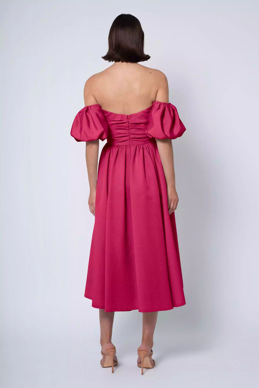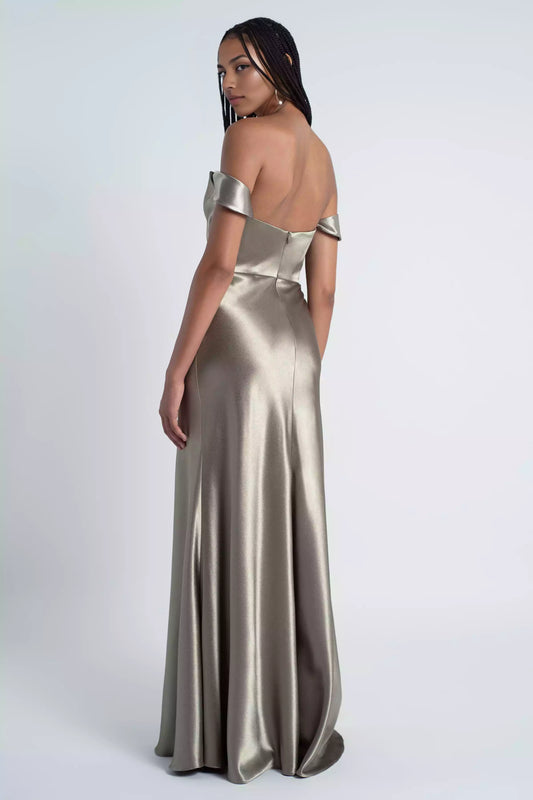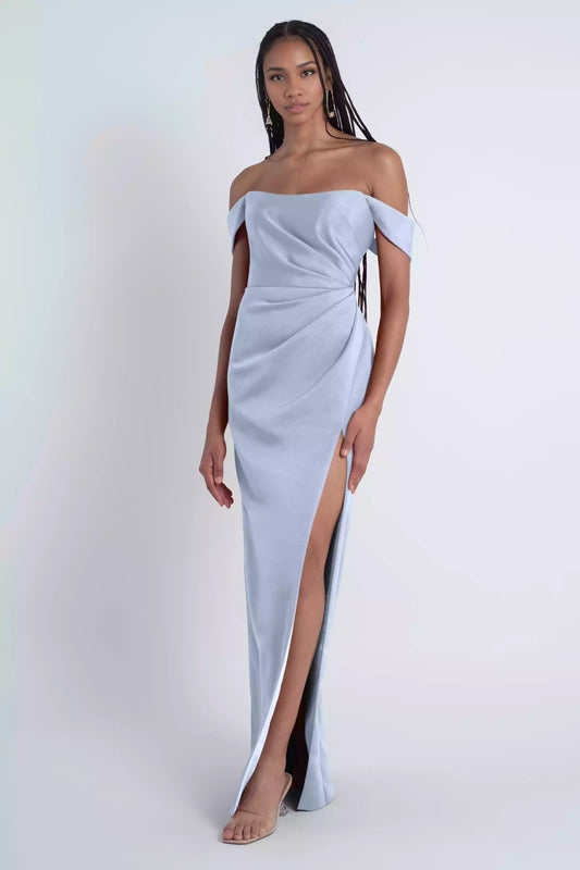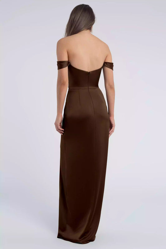 Elegant luxury satin off shoulder collar with ruffled edges, fitted corset, slim slit, tight corset, back zipper, Bridesmaid Dresses