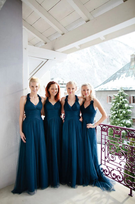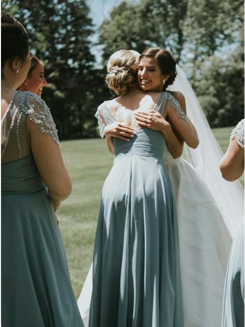 A-line sheer backless V-neck pleated long wedding bridesmaid dress
