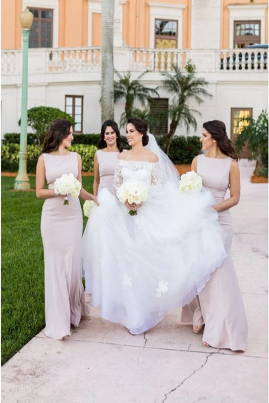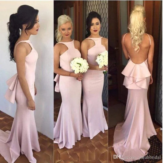 Simple mermaid elastic satin sweeping powder blusher bridesmaid wedding dress