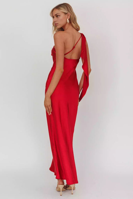 Gorgeous satin extra long single shoulder strap with ruffled edges, unlined, invisible side zipper, Bridesmaid Dresses
