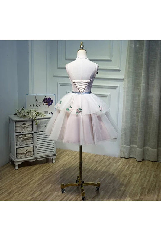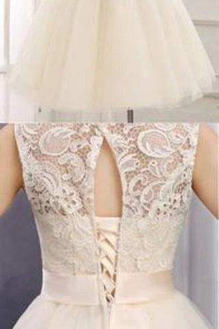 Lace Short Champagne Ball Dress Sleeveless Butterfly Knot Open Back Homecoming DressLace Short Champagne Ball Dress Sleeveless Butterfly Knot Open Back Homecoming Dress