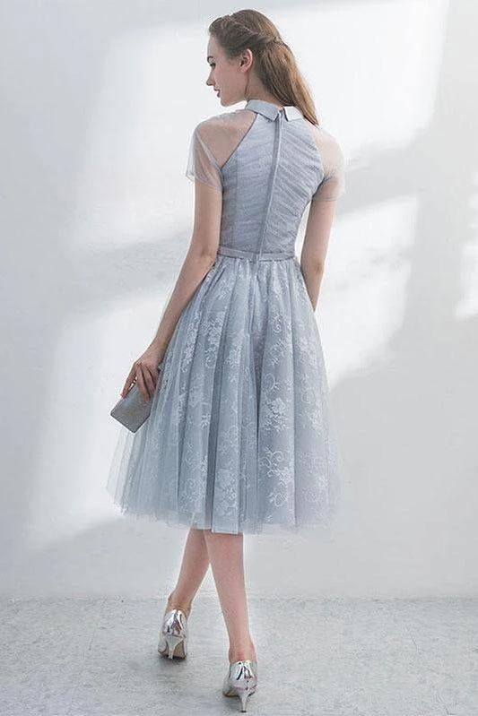 A-line short sleeve tulle backless encore with lace cute short cocktail dress
