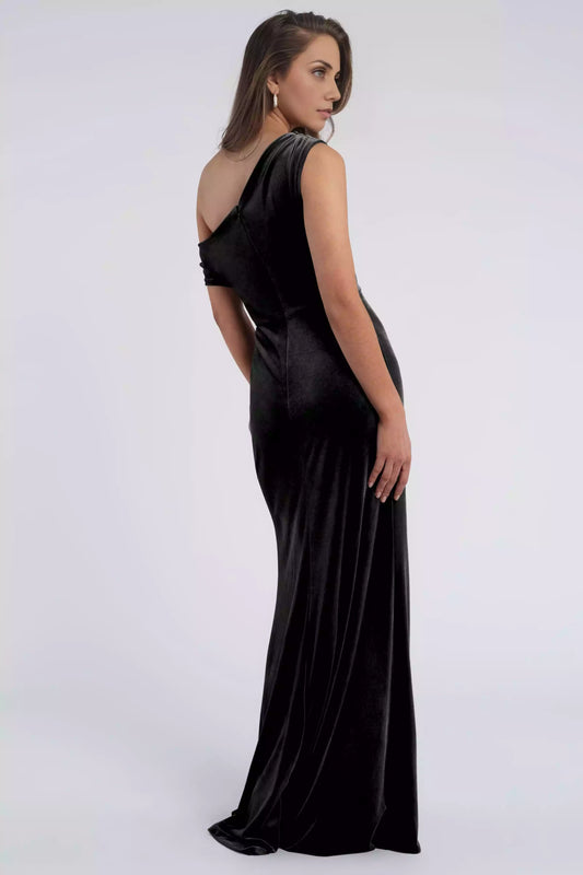 Charismatic asymmetrical dangling neckline with pleated details, elastic velvet tight fitting slant cut skirt, tight corset, back middle zipper, Evening Dresses