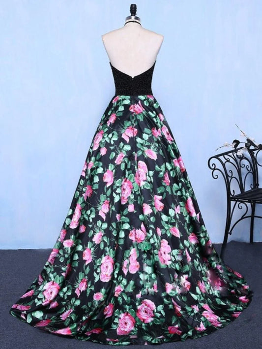 Black A-line Sleeveless Pocket Beaded Flower Floor Elegant Long Dress
