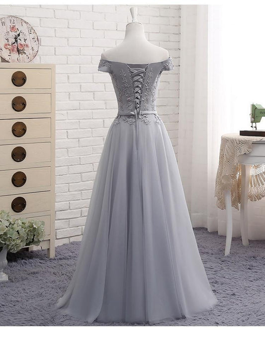 Cute A-line Grey Lace Off Shoulder Lace Lace Sticker Evening Party Ball Dress