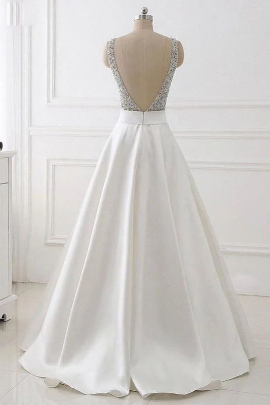 Charming and Elegant Ivory V-neck Satin Open Back Sleeveless Beaded Evening Dress