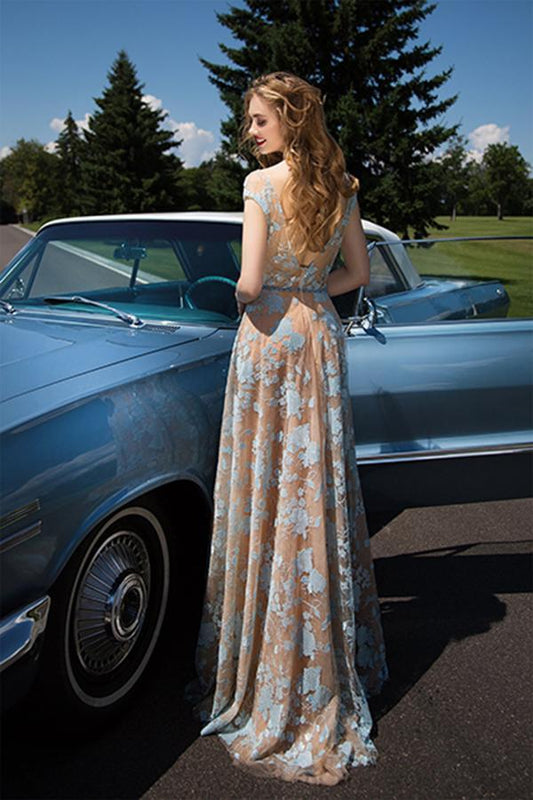 A charming blue lace backless tulle hollowed out floor to ceiling ball dress with sleeves