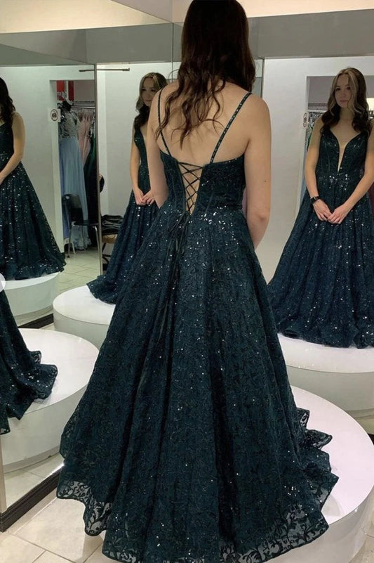 Shiny A-line elegant sheer lace sequin long dress