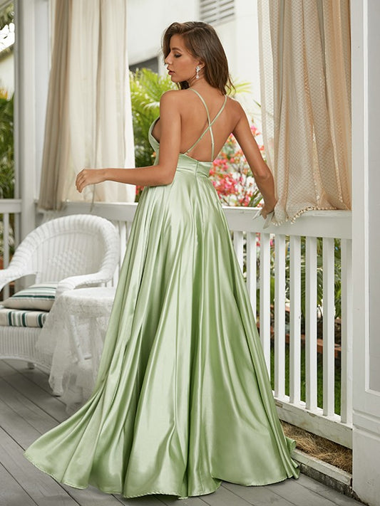 A-line elegant princess style pleated V-neck sleeveless floor length dress