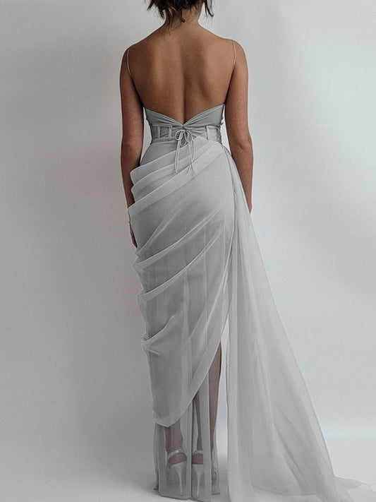 Slim fit column pleated thin shoulder strap sleeveless and floor length evening party dress
