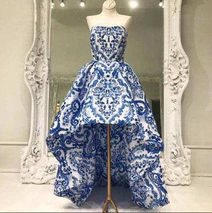 Princess A-line strapless high and low blue return to school party dress with printed long style party