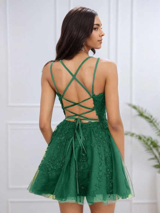 OKBBN Elegant V-neck sequined thin shoulder strap A-line Homecoming Dresses
