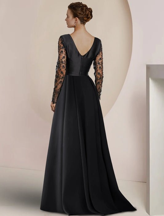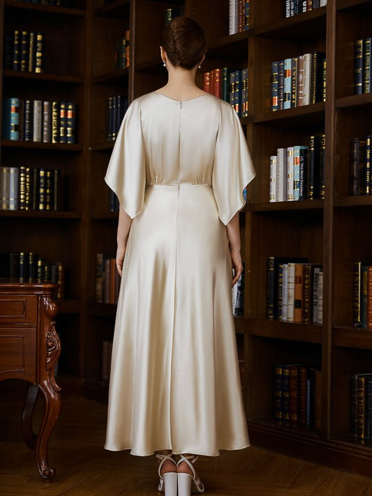 A-shaped Bride Mom Dress Wedding Guests Elegant Low Round Neck Tea Long Satin Lace Half Sleeve Bow Sticker