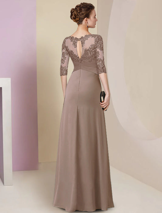 Sheath Column Bride Mother Dress Formal Wedding Guest Party Low Round Neck to Floor Length Chiffon Lace Belt Ribbon Applique