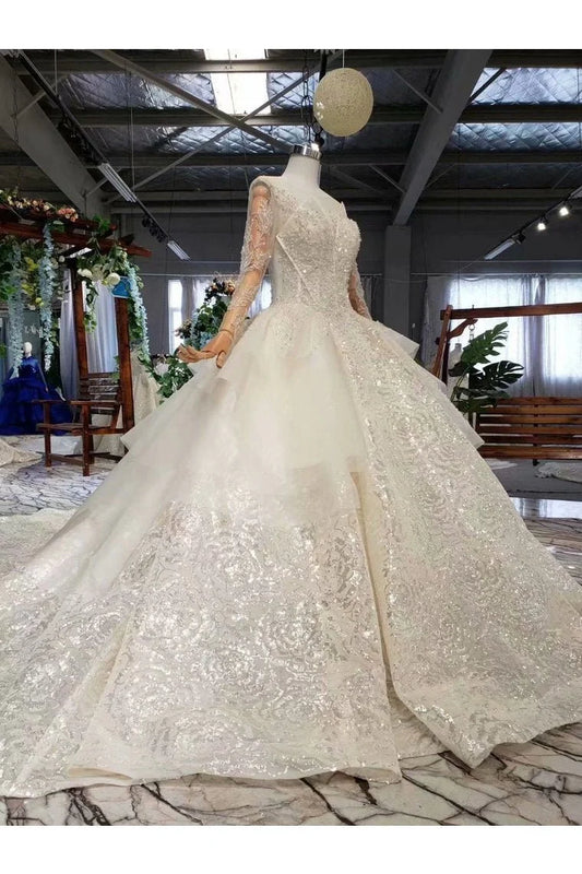 Elegant and Beautiful Bridal Dress Scoop Long Sleeves High Quality sheer with beading