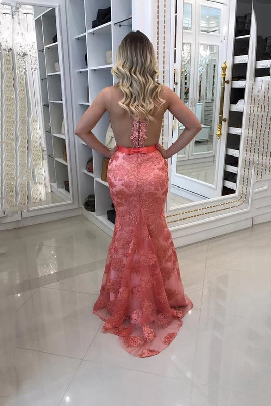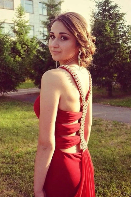 Minimalist Red Mermaid High Neck Ball Dress Chiffon Backless Evening Dress