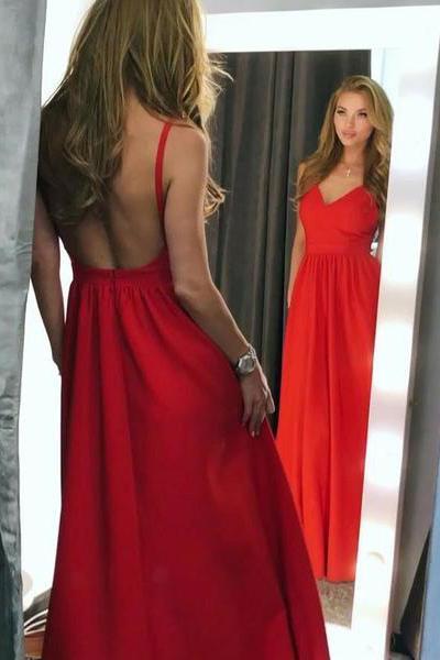 A simple A-line red spaghetti strap V-neck backless ball dress