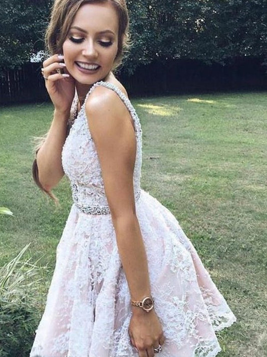 A-line Princess Lace Applique V-neck Sleeveless Short Dress