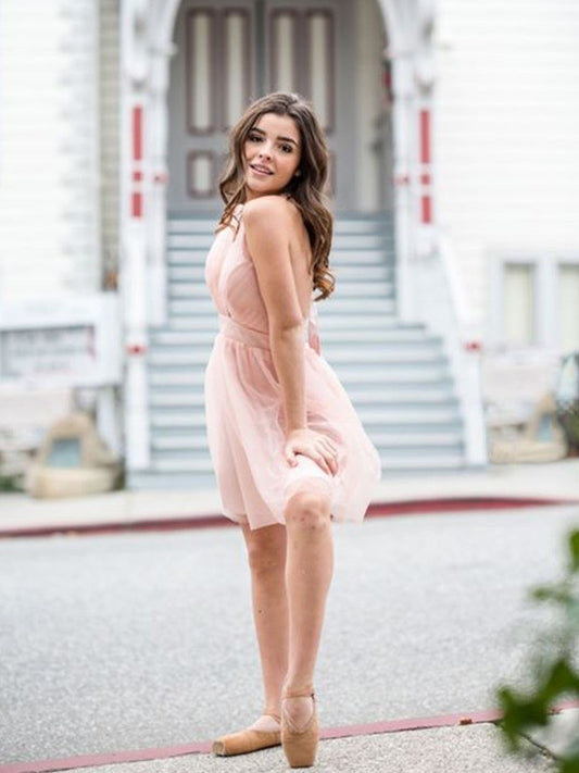 A-line Princess V-neck Beaded Tulle Sleeveless Short Back to School Dress