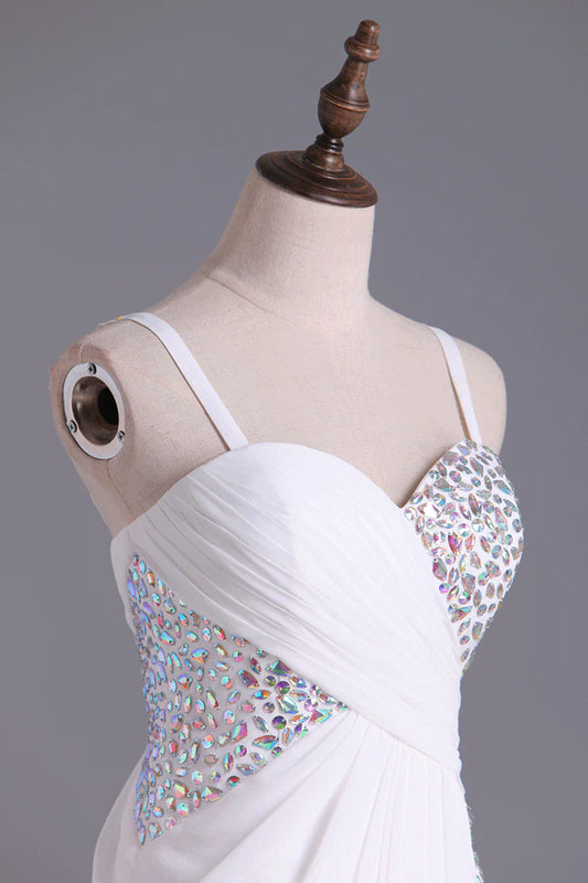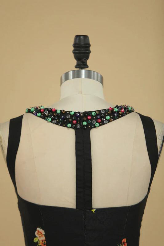 The short mini dress is adorned with chiffon beads and chiffon beads