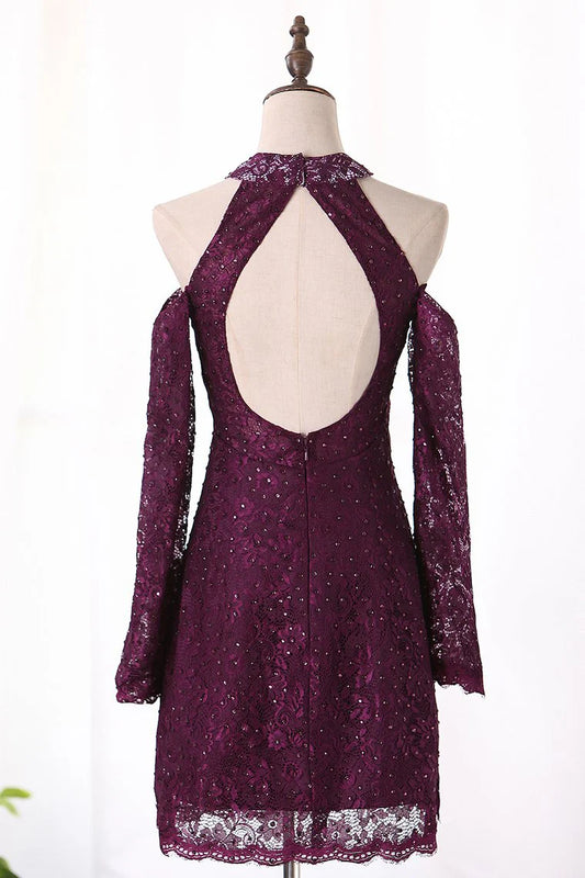 Elegant beautiful slim fit high neckline lace up dress with exposed back and long sleeves
