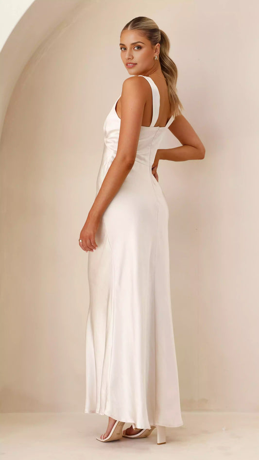 Elegant asymmetrical hanging collar, twisted shoulder straps, side pleats and slits, invisible back zipper Prom Dresses