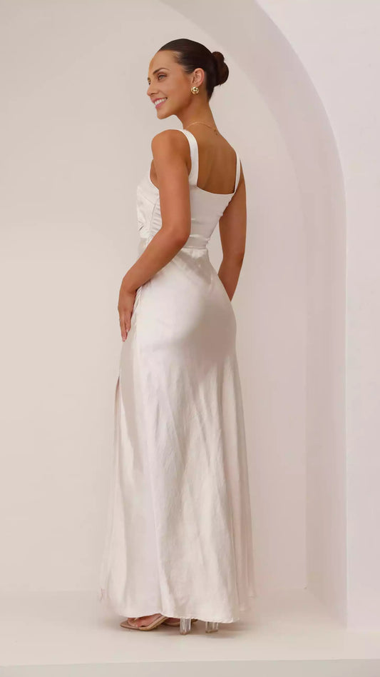 Stunning long square neckline, wide shoulder straps, side pleats, front slit showcasing graceful figure Prom Dresses