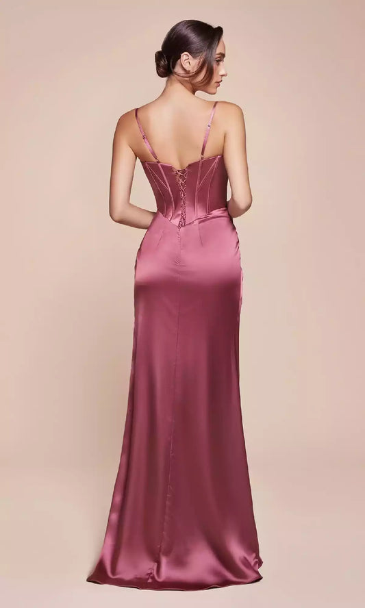 Stunning long satin beaded lace corset with V-neck pleats and side slits, Prom Dresses