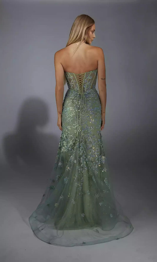Sparkling strapless long corset with sheer back straps, pleats, side slits, and a trailing trail, showcasing a charming style Prom Dresses