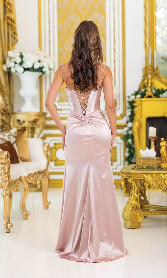 Beautifully stunning deep V-neck embroidered tight corset with lace up backless hem and side slits Prom Dresses
