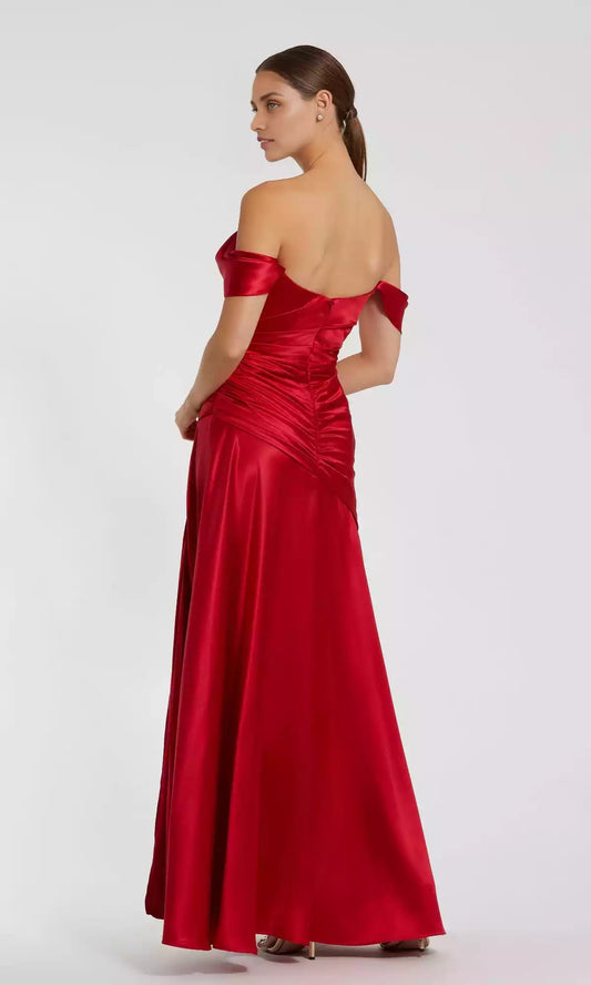 Gorgeous long hard satin off shoulder collar with asymmetrical pleats and slits Prom Dresses