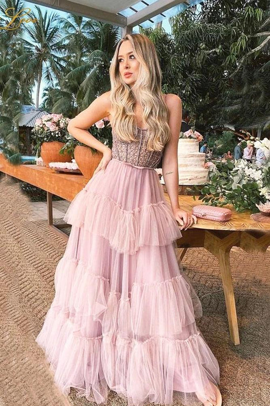 Pink layered ball long A-line beaded layered strapless sheer evening dress