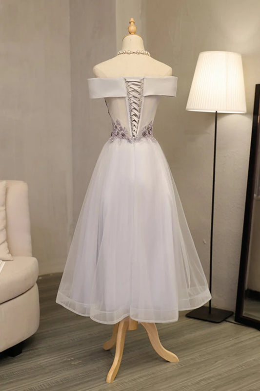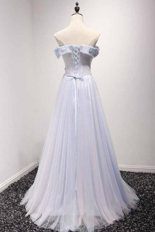 Sky Blue A-line Off Shoulder Floor Tulle Ball Dress with Lace