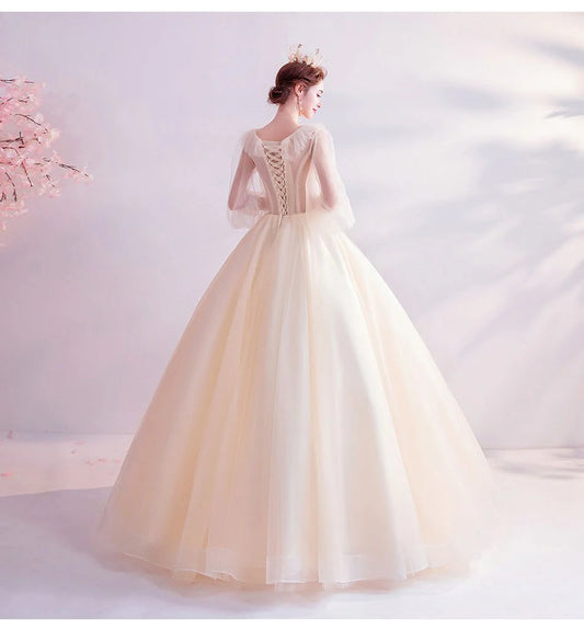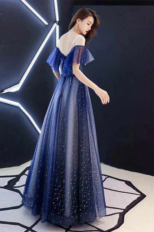 Beautiful sheer ball dress with A-line beto hat sleeves and dewdrops on the back