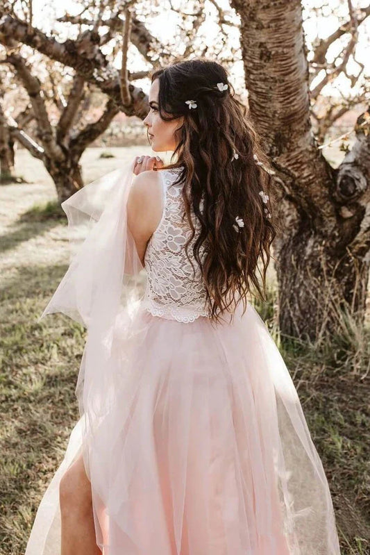 Round necked elegant sheer two-piece set of pink Bohemian ball dress