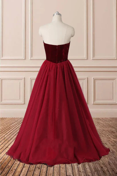 Sexy strapless A-line long V-neck sheer Burgundy sleeveless floor dance dress