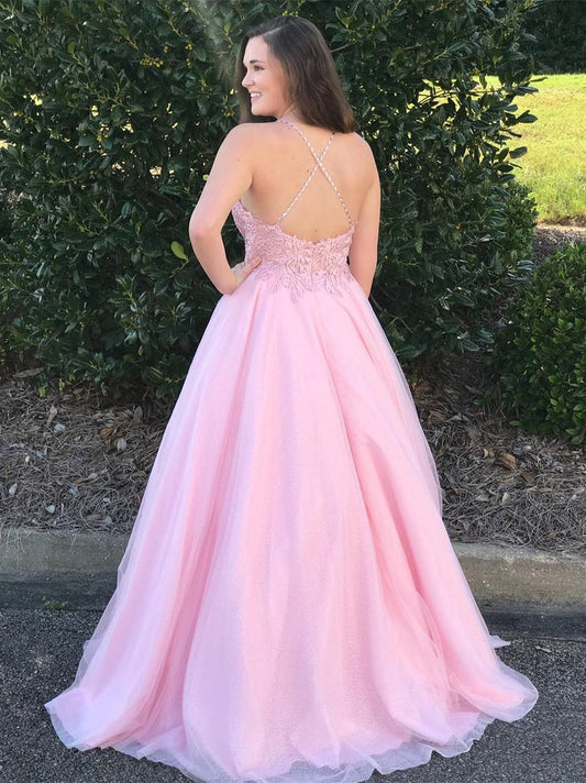 Noble and elegant A-line V-neck sheer lace backless long ball dress