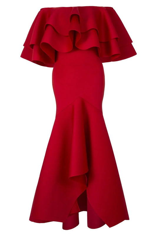 Ruffle Edge Off Shoulder High slit Ball Dress Fish Tail Brown Formal Dress