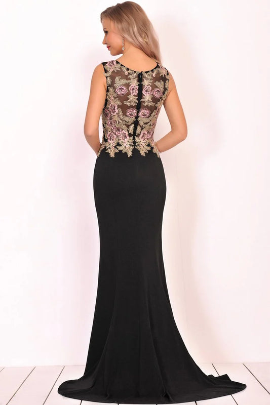 Fish Tail V-Neck Applique Horizontal Swinging Tailed Formal Dress