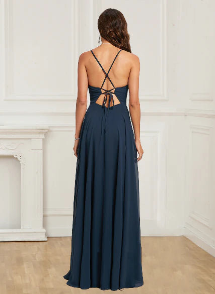 Sexy V-neck thin shoulder strap front slit simple ball dress long formal dress