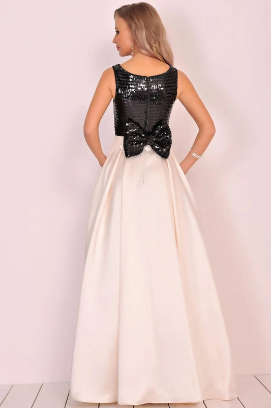 Embedding sequin bow A-line curved satin formal dress and floor length skirt