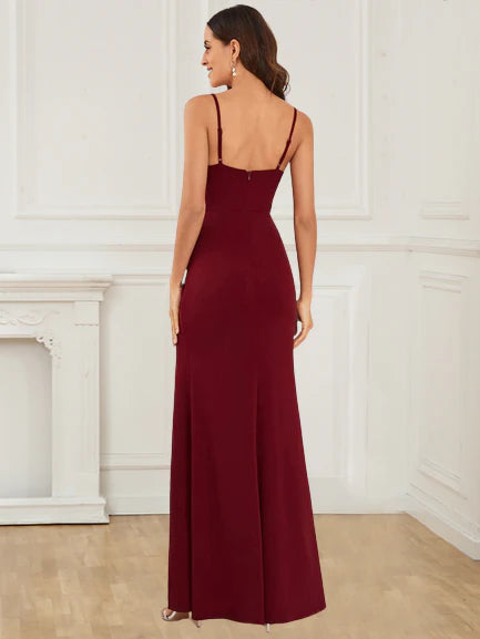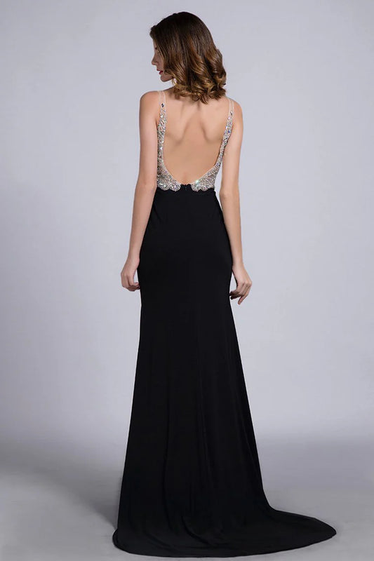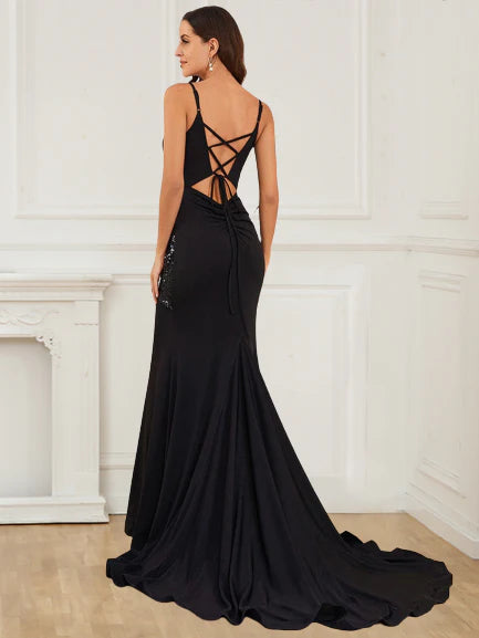 Amazing tight fitting thin shoulder strap V-neck sequin slit formal ball dress