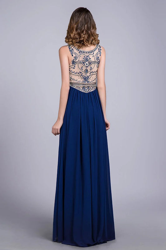 Chiffon shoulder strap beaded body A-line backless formal dress