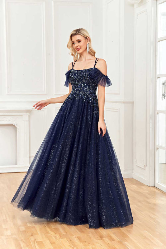 Shiny A-shaped Off Shoulder Tulle Sticker Beaded Lotus Edge Ball Party Dress