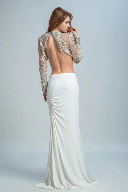 Elegant high necked hollowed out formal suit with tight fitting beaded sheer and ground length skirt