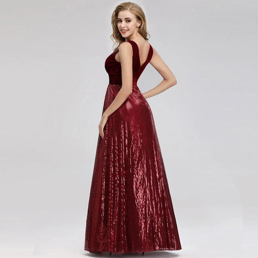 Charming wine red velvet sequin V-neck long cocktail formal ball dress