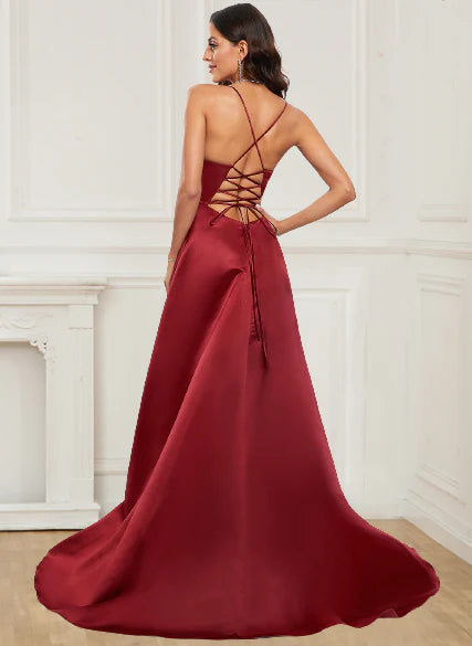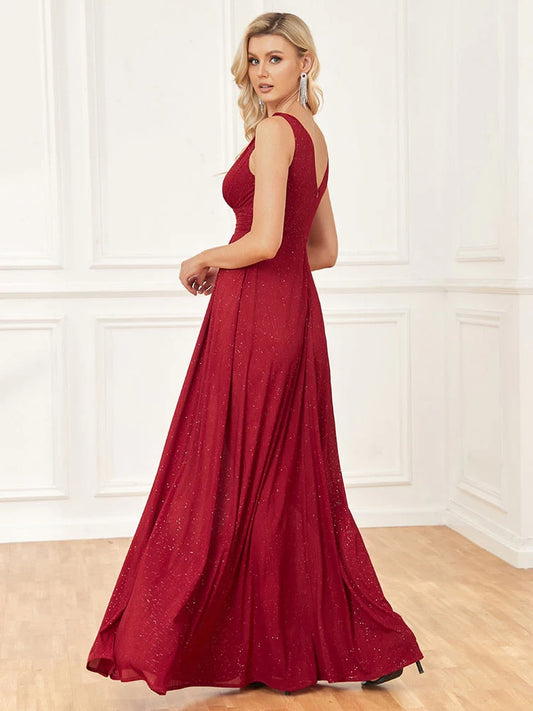 Red long V-neck sleeveless, simple and elegant formal ball dress