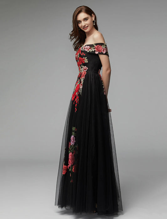 A-shaped floral dress for wedding guests ball and floor length sleeveless off shoulder lace sheer with embroidered stickers